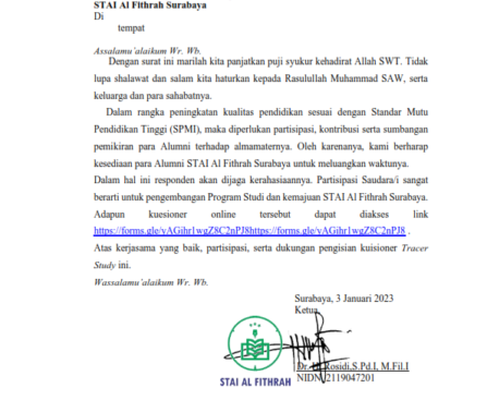 Kepada yang terhormat,Para Pengguna LulusanSTAI Al Fithrah SurabayaDitempat Assalamu’alaikum Wr. Wb.Dengan surat ini marilah kita panjatkan puji syukur kehadirat Allah SWT. Tidaklupa shalawat dan salam kita haturkan kepada Rasulullah Muhammad […]